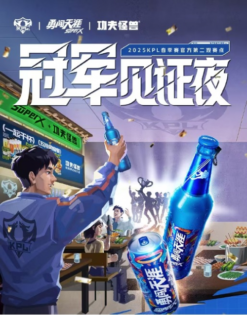 自2023年以来,勇闯天涯SuperX连续三年担任KPL王者荣耀职业联赛的年度合作伙伴。这一合作不仅是一种营销手段,更是一种对目标消费群体生活方式的全方位融入。在赛事期间,品牌围绕「勇闯巅峰冠军之夜」和「冠军见证夜」等活动节点,通过定制化的庆祝场景和限量版「冠军庆功酒」,将“勇闯”精神巧妙地融入了电竞粉丝的观赛体验中,赋予品牌更深层次的文化意义。